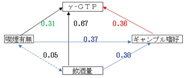 ここではギャンブル嗜好のγ-GTPへの真の影響度を知りたいのでギャンブル嗜好が調べたい変数です。