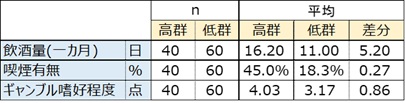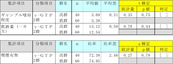 平均値から、γ-GTPの高群は飲酒量多者や喫煙者が多く、低群は飲酒量少者や非喫煙者が多いことが分かります。このような状況でギャンブル嗜好程度の平均について高群と低群を比較すると、ギャンブル嗜好と飲酒量との相関、ギャンブル嗜好と喫煙有無との相関が高いことから、ギャンブル嗜好程度は高群の方が低群より高くなるのは当然です。