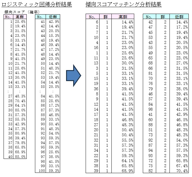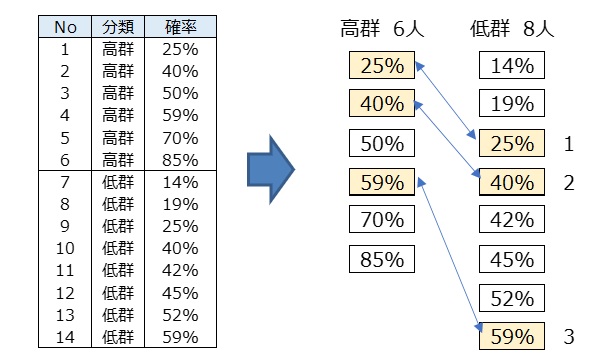 (例)高群No2は19.4%、低群No47は17.2%で一致していないが、許容範囲3%以内のためマッチング
