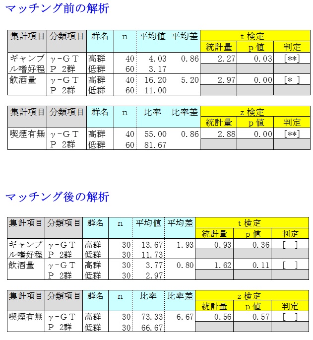 γ-GTP高群と低群でギャンブル嗜好程度の平均を比較する際、両群の飲酒量や喫煙有無が同等であれば真の比較ができます。すなわち、高群と低群で飲酒量や喫煙有無が似ているサンプルだけを取り出して比較すればよいのです。
