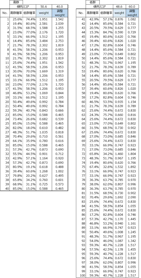 各々の合計が群別合計(高群40人、低群60人)に一致するように、各個体のWeightを調整します。