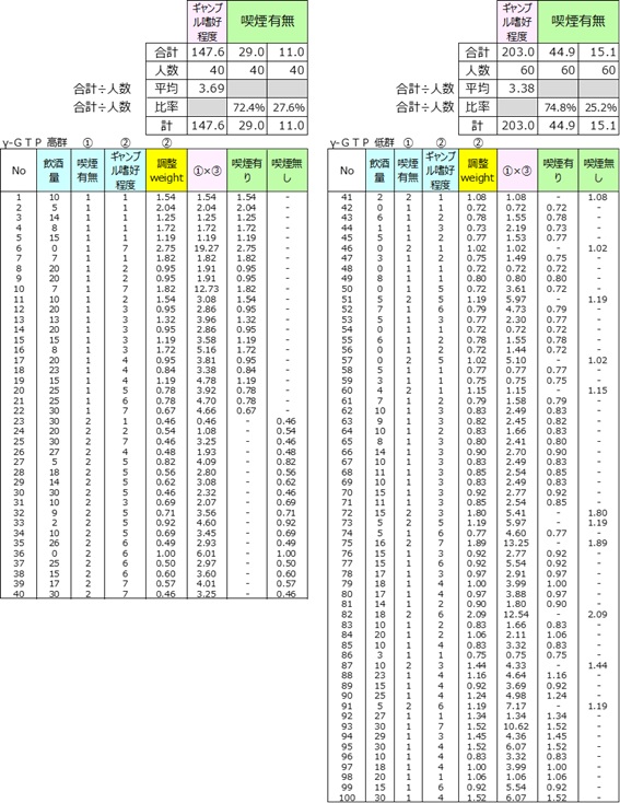 具体例のデータについて、γ-GTP高群、低群別の平均を算出しました。