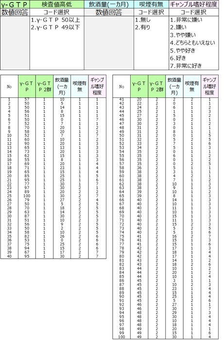 そこで、100人の成人男性について、γ-GTP、飲酒量(一カ月に飲酒する日数)、喫煙有無、ギャンブル嗜好(7件法)を調査しました。