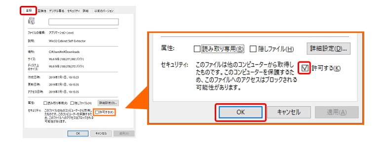 右クリックし、プロパティの「全般」タブを表示させます。 - 最下部「セキュリティ」で「許可する」にチェックを入れ 、「適用」「OK」の順にクリックします。